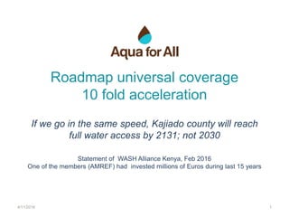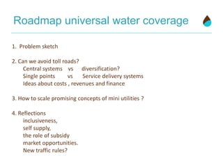 This document discusses accelerating universal water coverage in Kajiado County, Kenya from the current pace which would not achieve full access until 2131. It notes that one organization invested millions of Euros over 15 years but made limited progress towards goals. The document then outlines several mini case studies of innovative water distribution models using water kiosks and home delivery. It discusses challenges around funding, sustainability, and innovation and proposes ways to scale up promising concepts through public-private partnerships and new financing approaches.
