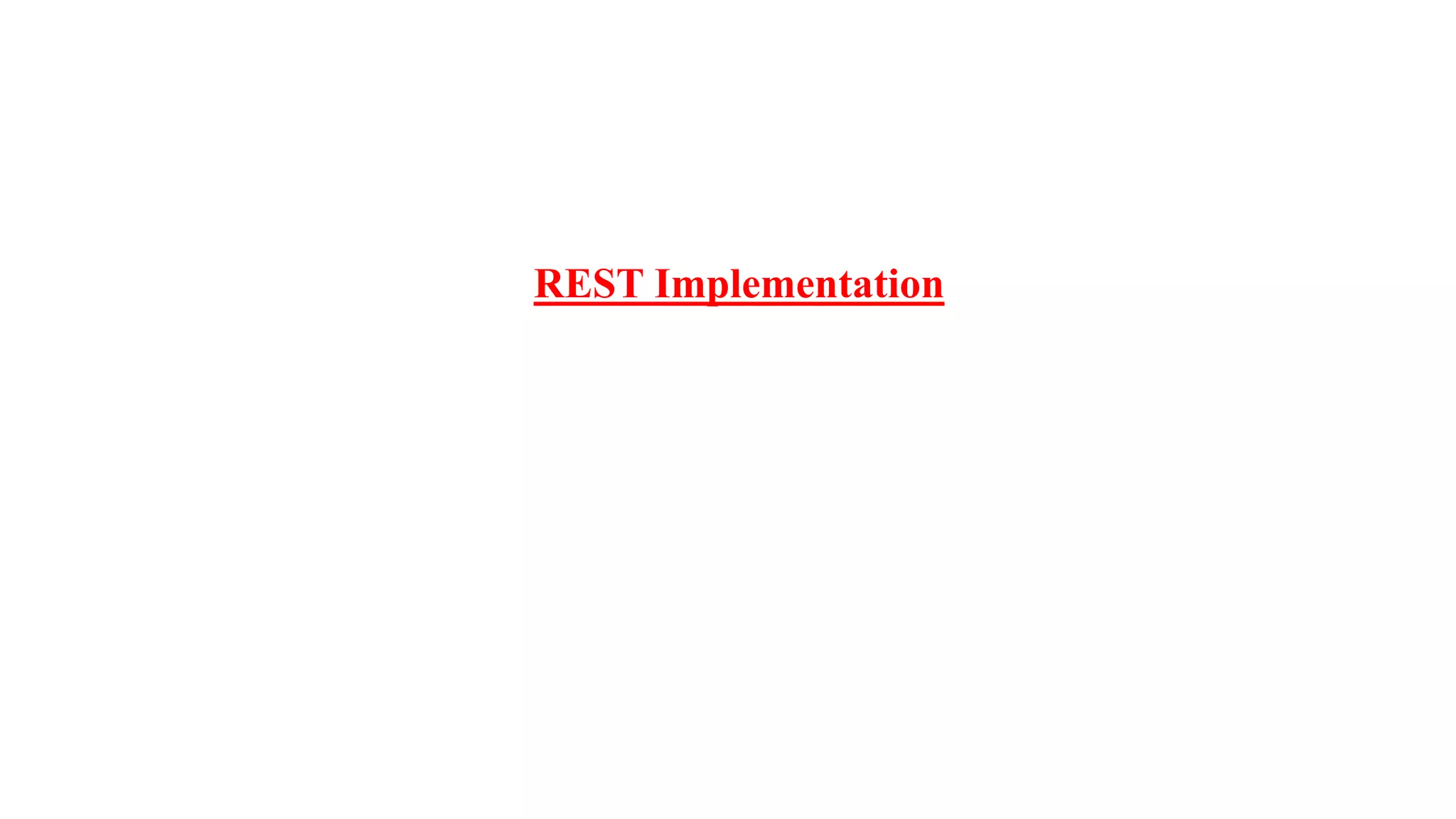 This document provides an overview of REST (Representational State Transfer) architecture and how to implement RESTful web services. It discusses key REST concepts like resources, URIs, HTTP methods, statelessness, caching and security. It also describes how to create a RESTful web service in Java using the JAX-RS API and annotations like @Path, @GET, @POST etc. to define resources and map HTTP methods.