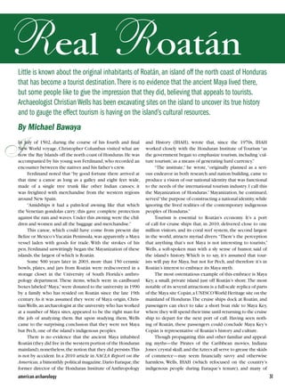This document summarizes an archaeological project on the island of Roatán off the coast of Honduras. It discusses how little is truly known about the island's original inhabitants, despite efforts to portray them as Maya for tourism purposes. Archaeologist Christian Wells has been excavating sites on the island to uncover its real history and determine the impact of tourism. At the site of Augusta, an 18th-century British settlement, Wells has found evidence of interactions between the British colonists and indigenous Miskitu people. However, increased tourism and development threaten the island's archaeological resources through new construction and looting.