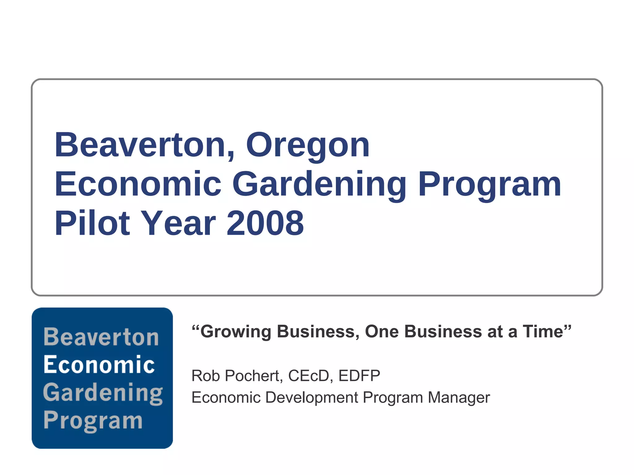 The document describes Beaverton, Oregon's economic gardening program pilot from 2008. Economic gardening is a business development approach that targets existing local businesses with growth potential using data resources. Beaverton launched its pilot program to support local businesses as traditional recruitment had not worked and developable land was limited. The program provided businesses with information, infrastructure connections, and strategic data to increase competitiveness and sales. Initial client feedback was positive, with most satisfied and planning to use the services again.