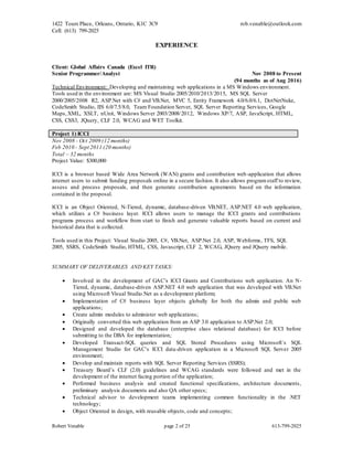 This document contains the resume of Robert Venable. It summarizes his contact information, certifications, technical skills, security clearances, and work experience developing web applications for various clients over 15+ years using technologies like ASP.NET, C#, VB.NET, SQL Server, and more. His most recent experience includes developing grants management applications for Global Affairs Canada.