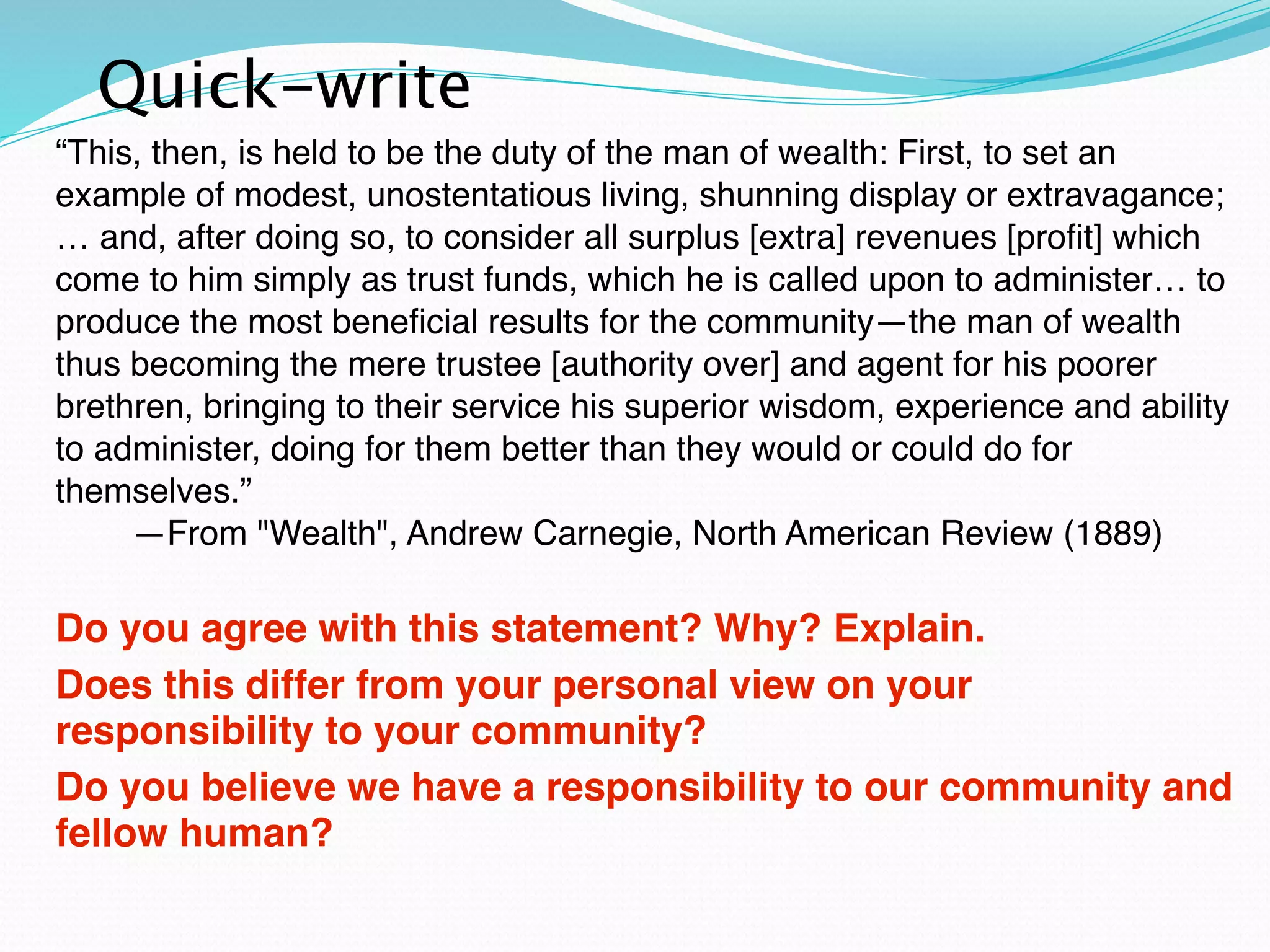 This document outlines Andrew Carnegie's view that men of great wealth have a duty to redistribute their surplus wealth for the benefit of the community. Carnegie argues that the wealthy should live modestly and see their wealth as a trust to be used to administer and produce benefits for the poorer members of society. The document asks the reader to consider if they agree with this view and if it differs from their own perspective on responsibilities to the community. It prompts reflection on whether we have obligations to our fellow humans.