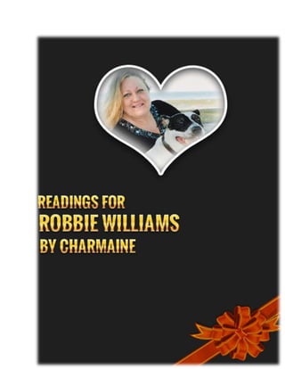 The document consists of seemingly disjointed readings and musings addressed to Robbie Williams, highlighting various personal reflections, spiritual insights, and predictions about his life, career, and relationships. It features a mix of humor, advice, and messages from a spirit world, indicating an ongoing spiritual connection and a quest for companionship and success. The narrative hints at themes of jealousy, business ventures, and the impact of past relationships on the present.