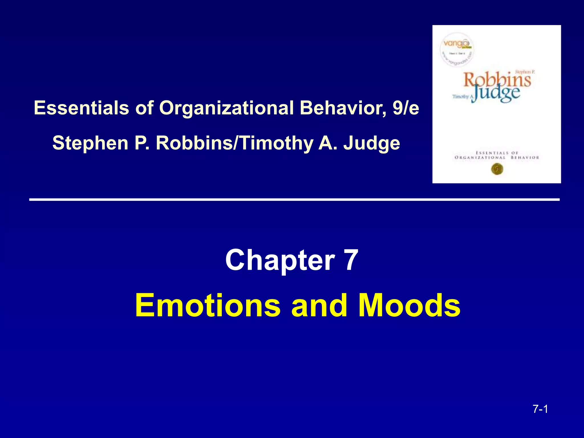 This document summarizes key concepts from a chapter on emotions and moods in organizational behavior. It defines emotions and moods, discusses their aspects and sources, and external constraints. It also covers emotional labor, the case for and against emotional intelligence, and applications of emotions and moods to areas like decision-making, leadership, and customer service. The goal is to help readers understand the role of emotions and moods in explaining and predicting workplace behavior.