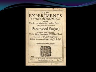 Robert Boyle was born in 1627 in Ireland to a wealthy family and received an elite education. He studied natural philosophy and helped form the Invisible College, a group of scientists that later became the Royal Society. Boyle made significant contributions to chemistry through his experiments and publications, including discovering gases, developing Boyle's Law about the inverse relationship between a gas's pressure and volume, and showing that compounds have different properties than their constituent elements. His scientific work helped establish the experimental method in chemistry and advance the professionalization of science.
