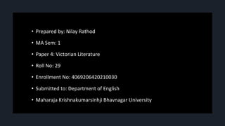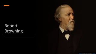 Robert Browning was an English poet who lived during the Victorian era. He was educated at home by his father's large library and was fluent in multiple languages by age 14. Browning never had a formal career and was financially dependent on his family until age 34 when he married Elizabeth Barrett. Their marriage faced disapproval from her father. Browning published his first work anonymously in 1833 and gained recognition in the 1850s after his wife encouraged him to publish collections of his works. He had a significant influence on styles of poetry, particularly dramatic monologues, and was one of the most important Victorian poets.