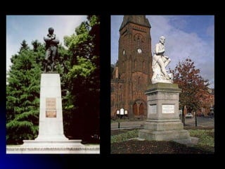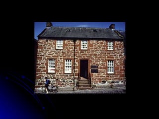 The document provides biographical details about the renowned Scottish poet Robert Burns. It describes how he was born into a poor farming family in 1759 and became fluent in French through self-study. It discusses his early romantic interests that inspired some of his poems. It also outlines his marriage, career as a poet and excise officer, popular works such as "Auld Lang Syne", and his untimely death at age 37 in 1796.