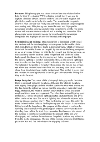 Robert Capa was a Hungarian war photographer who documented five major wars of the 20th century, including the Spanish Civil War, World War II, and the First Indochina War. He is best known for his photos from the D-Day Normandy landings, where he captured images of soldiers hiding behind obstacles on Omaha Beach under fire. Capa took these photos to show the true brutality and suffering of war, countering propaganda that portrayed war as glorious. He composed his photos to depict both the foreground subjects and background setting to fully capture the scenes of war.