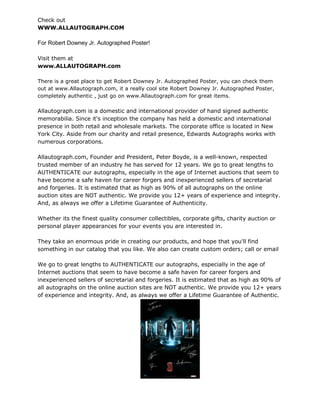 Allautograph.com is a website that sells authentic autographed memorabilia from celebrities like Robert Downey Jr. The site has been in business for over 12 years and takes steps to ensure the authenticity of their autographed items. They offer a lifetime guarantee of authenticity and sell products for personal collections, corporate gifts, and charity auctions. The company is located in New York City and prides itself on creating high quality, authentic collectibles.