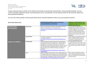 The document is a glossary created by Robert Hillard-Linney for a unit on sound design and production. It contains definitions for over 20 key terms related to sound design methodology, file formats, audio limitations, audio recording systems, audio sampling, and MIDI instruments. Each definition includes a short researched definition from an online source and Robert's description of how the term relates to his own production practice.