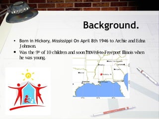 Robert Johnson was the founder of Black Entertainment Television (BET) and the first African American billionaire. He was born in 1946 in Mississippi and grew up in Illinois. He earned degrees from the University of Illinois and Princeton University. After seeing that black audiences were underserved on television, he convinced cable executives to fund BET, which launched in 1980. BET grew rapidly and Johnson sold it to Viacom for $3 billion in 1998, making him the first black billionaire. He has since founded other successful companies targeting underserved markets.