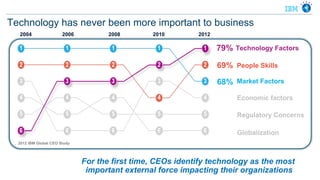 2) It highlights how CEOs now see technology as the most important external force impacting organizations and how CIOs are turning to innovative technologies like big data, mobile, cloud, and security to deliver business outcomes.