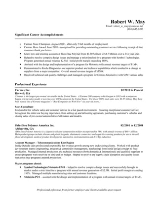Rob May has over 15 years of experience in account management, business development, and sales. He has a proven track record of exceeding sales goals and generating new revenue streams. Some of his core skills include relationship building, communication, and adapting to different work environments. He is seeking a new opportunity where he can apply his skills and experience to help grow a business.