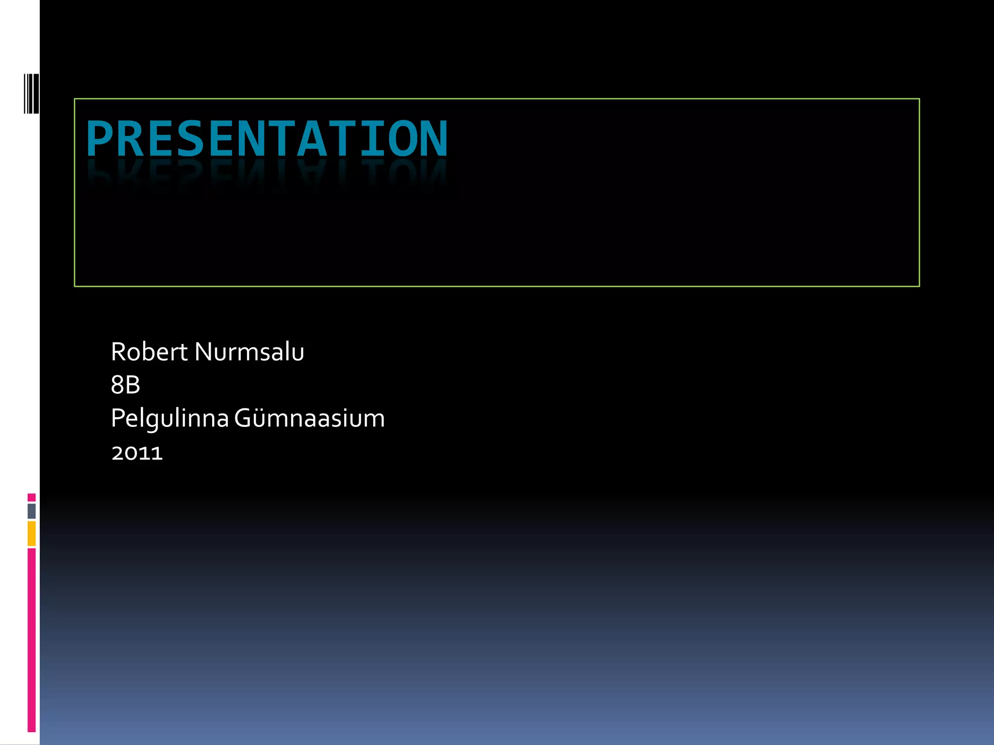 Robert Nurmsalu presented about his home and surrounding area. He lives in an apartment that is closer to his school than his previous home. Near his home is a bus stop he uses to get to school, a beach he enjoys swimming at in the summer, a football area, and a park next to the beach. He gave a quick tour with pictures taken on his phone to show these locations and expressed hope that the presentation was enjoyed.