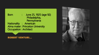 Robert Venturi is an American architect born in 1925 in Philadelphia. He studied architecture at Princeton University and is known for coining the phrase "Less is a bore" as a postmodern response to Mies van der Rohe's modernist motto of "Less is more." Venturi founded the firm Venturi, Scott Brown and Associates and was awarded the Pritzker Prize in 1991, making him one of the major architectural figures of the 20th century.