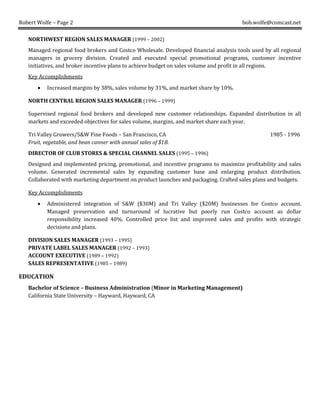 Robert Wolfe is a sales and account management professional with over 30 years of experience in the consumer packaged goods industry, most recently as a Regional Sales Manager at American Rice Inc. where he managed key accounts and increased annual sales. Prior to that he held various sales and management roles at companies like C&H Sugar Company and Tri Valley Growers/S&W Fine Foods where he consistently exceeded sales targets and improved margins. He has a proven track record of developing new business, expanding distribution, negotiating agreements, and leading teams to boost revenue and profits.