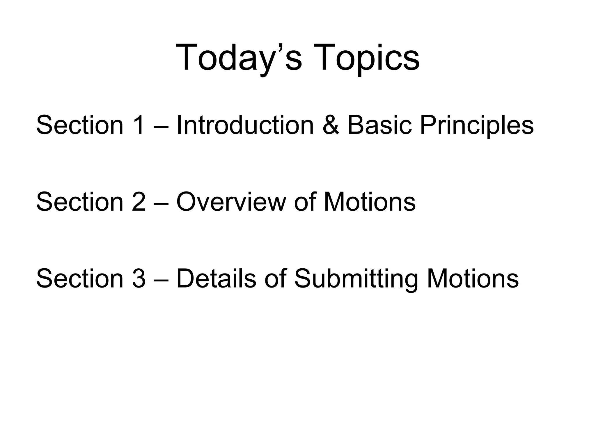 The document summarizes parliamentary procedures and Robert's Rules of Order. It discusses basic principles such as maintaining order during meetings, the rights of members, and the role of the presiding officer. It also provides an overview of motions, including main motions, amendments, and laying a motion on the table temporarily. The goal is to ensure fairness and order during decision-making processes.