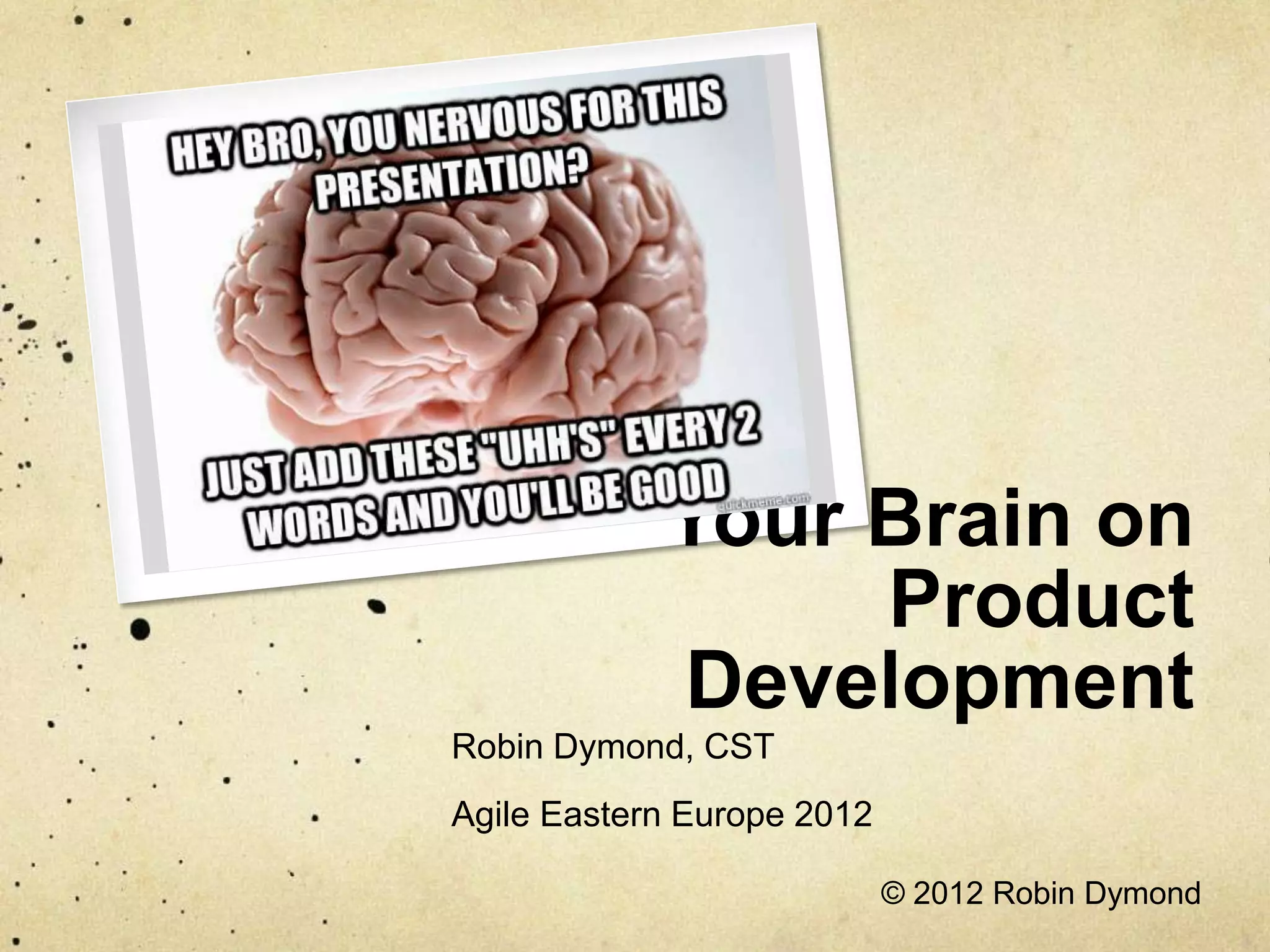 The document discusses recent discoveries in brain science and how they relate to product development. It explains that the prefrontal cortex has limited resources for problem solving and insights emerge when larger brain regions are engaged. It also discusses how the brain's threat response hinders thinking and how understanding one's internal states can help manage cognitive processes and insights. Strategies presented include practicing mindfulness, managing emotions, focusing attention on direct experiences, and using Scrum to address the brain's social needs.