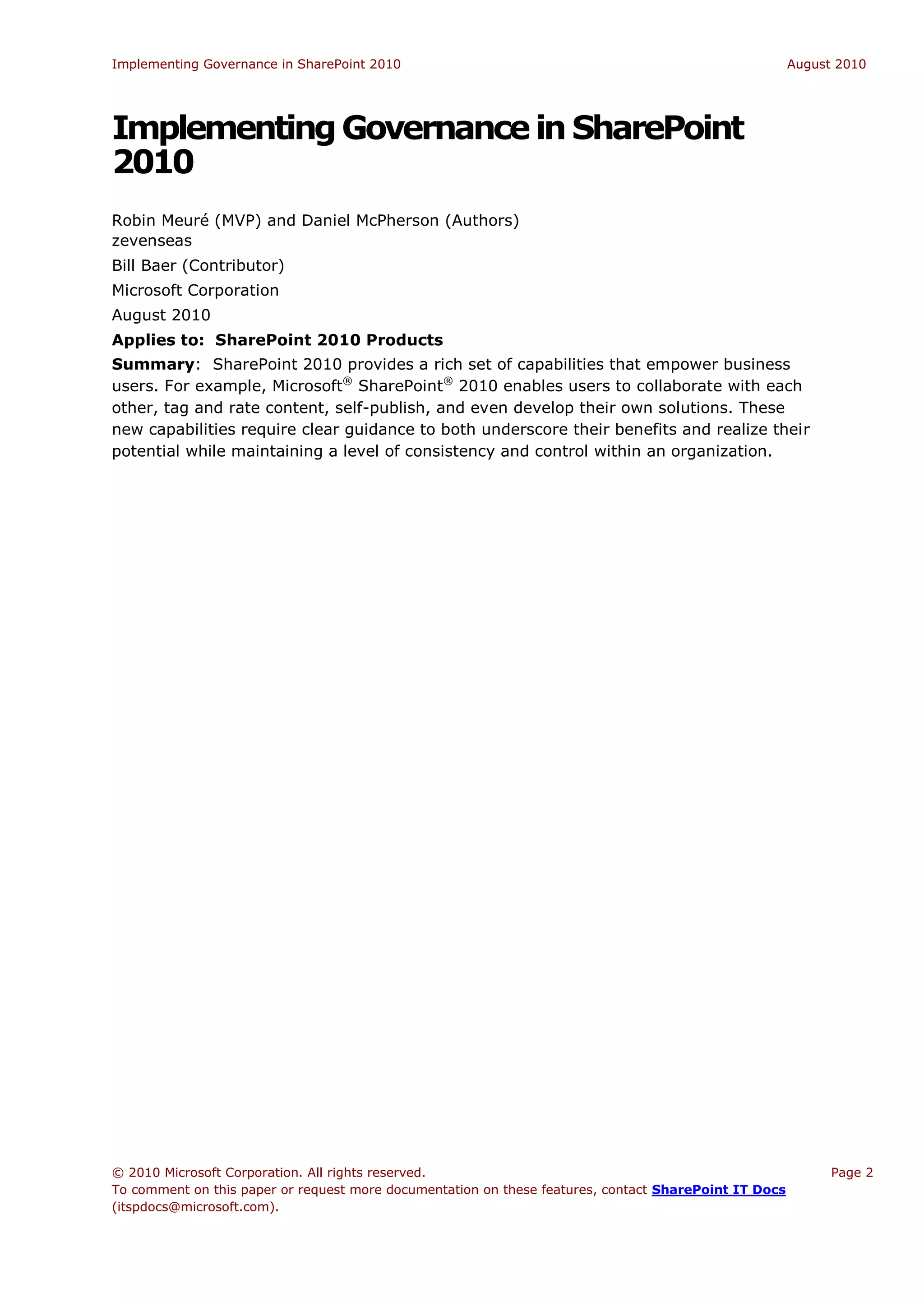 This document provides guidance on implementing governance controls in SharePoint 2010 to maintain consistency and control while empowering users. It discusses controls at the farm, web application, and site collection levels including managing service accounts, diagnostic logging, backup procedures, content types, security policies, and more. The goal is to realize the benefits of user empowerment in SharePoint while still enforcing appropriate centralized governance.