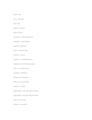 Tài liệu liệt kê các tính từ thông dụng kèm theo giới từ mà chúng đi cùng. Mỗi tính từ đều có nghĩa tiếng Việt tương ứng, giúp người học hiểu rõ cách sử dụng chúng trong ngữ cảnh. Đây là một nguồn tài liệu hữu ích cho việc học từ vựng tiếng Anh.