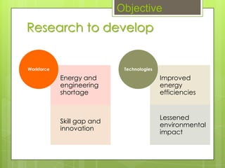 This document discusses the need to develop the energy and engineering workforce through research, education, and skills development programs. It notes that over 50% of the current workforce will retire in the next 10-15 years, creating gaps. Proposed solutions include delivering STEM education from K-12 through doctoral programs, with hands-on learning and research opportunities. Areas of research focus include fossil energy, renewable energy, and climate modeling. The goal is to create an industry-ready and diverse workforce through partnerships between education, government, and industry. Challenges include a lack of pre-implementation data and engineering concepts in K-12 curriculum.