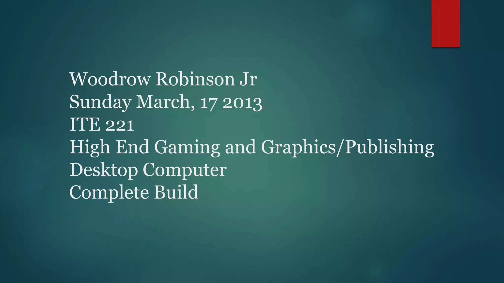 This document outlines the specifications and pricing for components for a high-end gaming and graphics desktop computer build. It provides details on the components, including the ASUS Rampage IV Extreme motherboard, Intel i7-3960X processor, Corsair Dominator Platinum RAM, Zalman CPU cooler, Azza Titan power supply, AMD Radeon HD 7870 graphics card, Asus monitor, NZXT Phantom case, peripherals, and total pricing. The total for all components is $3469.22. Alternatively, a pre-built Alienware computer could be purchased for $1500, while the author currently has an Acer Aspire laptop that was $299.
