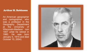 The Robinson projection, developed by American geographer Arthur H. Robinson in 1963, is a visually appealing map that displays the poles as lines rather than points. It is a compromise projection that minimizes distortion of size, shape, and distance across the map. Robinson's approach utilized trial-and-error computer simulations rather than new geometric formulas to create the projection's unique characteristics.