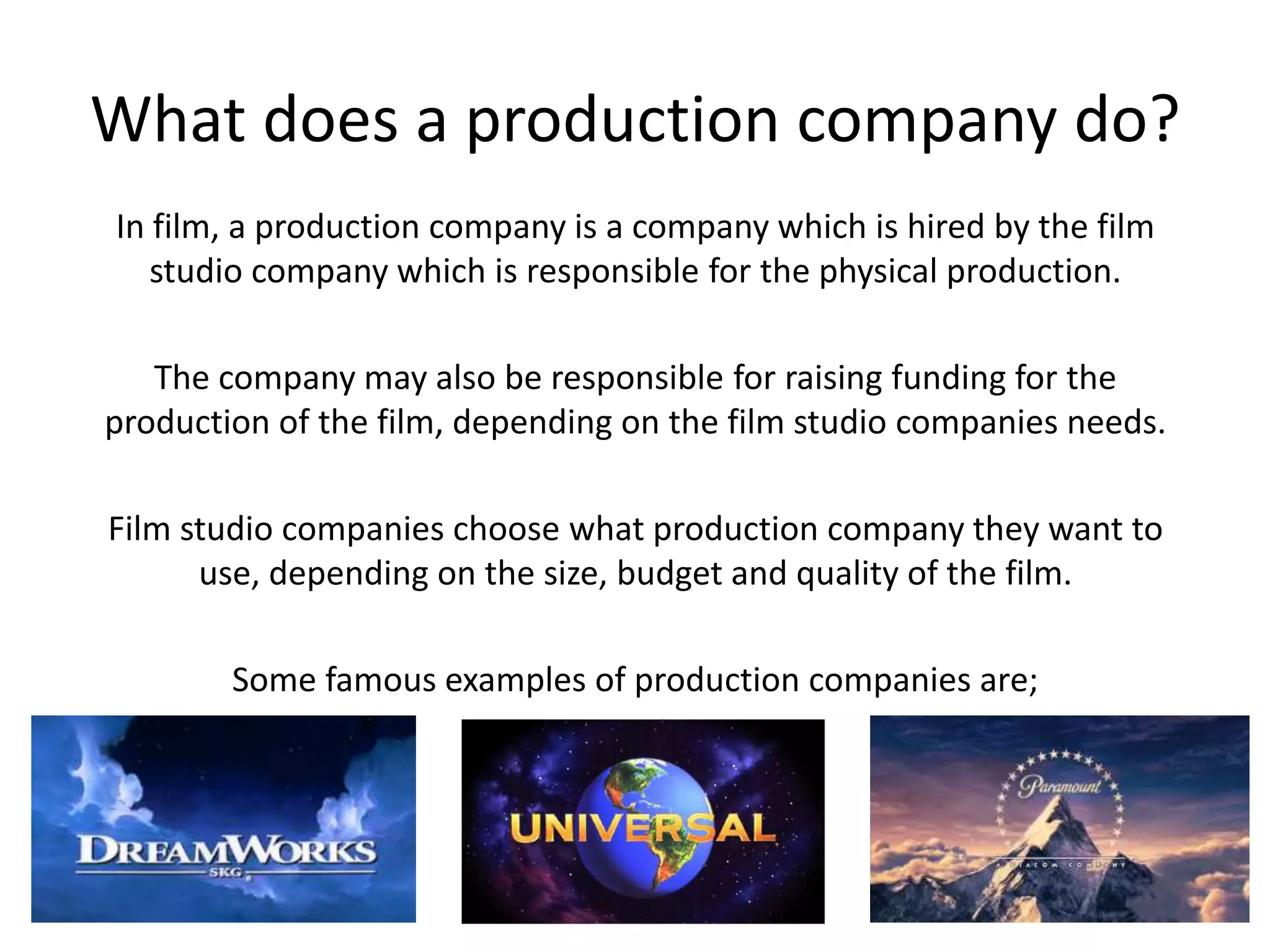 The document discusses media institutions involved in film production and distribution. It defines that a production company is responsible for the physical production of a film and may help raise funds. Film studios select production companies based on size, budget and quality. The document also explains that a distributor is responsible for releasing a film to the public through promotion, marketing, and getting the film into cinemas and on other platforms. The authors chose their distributor, Metrodome, because it had experience distributing a similar film. Funding for films can come from donations to the National Lottery fund distributed by the UK Film Council to support the British film industry.