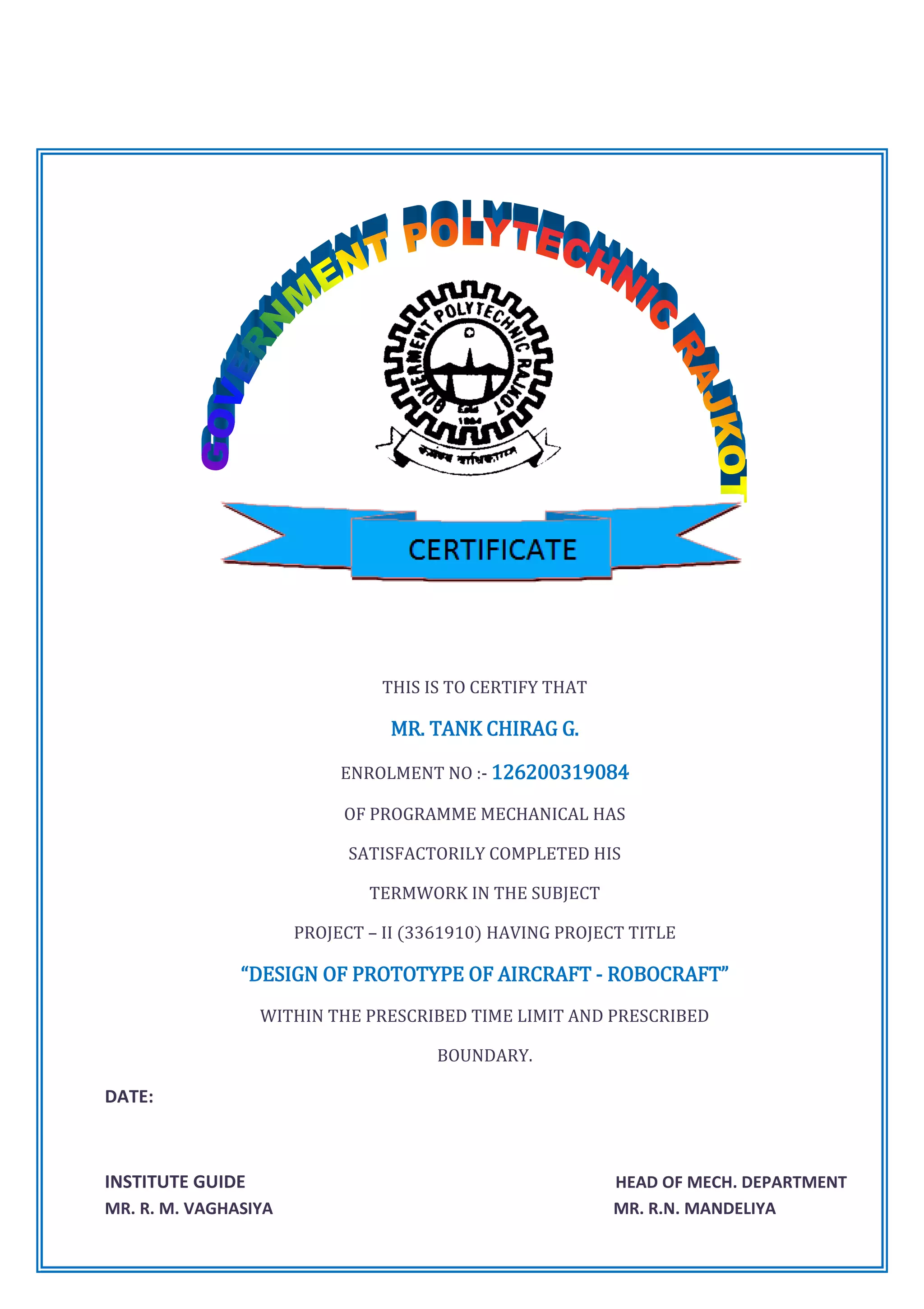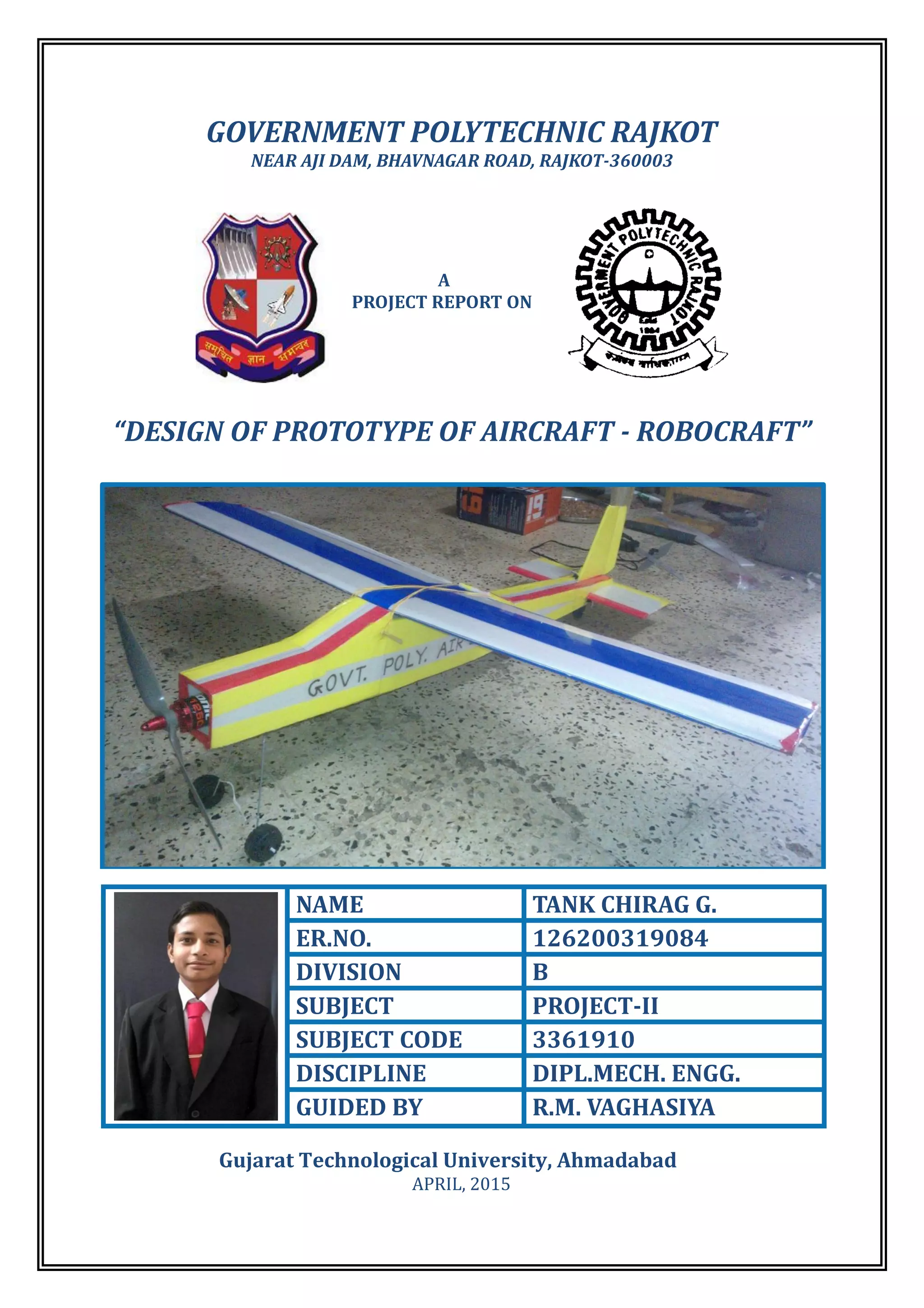 The document is a project report for the design of a prototype aircraft, titled 'Robocraft', prepared by a mechanical engineering student at the Government Polytechnic in Rajkot, under the guidance of faculty members. It discusses the project's objectives, acknowledgments, and essential concepts related to aerodynamics, including working principles, construction details of the aircraft, and the materials used. Additionally, the report outlines the project's future plans and innovations in aircraft technology.
