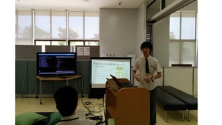 This document discusses several robotics projects including the development of a robot called D.K.T. IcARus by a student named Kensei Demura, benchmark tests of the Turtlebot robot hardware conducted outside, and projects involving cloud-based drones and an augmented reality game.