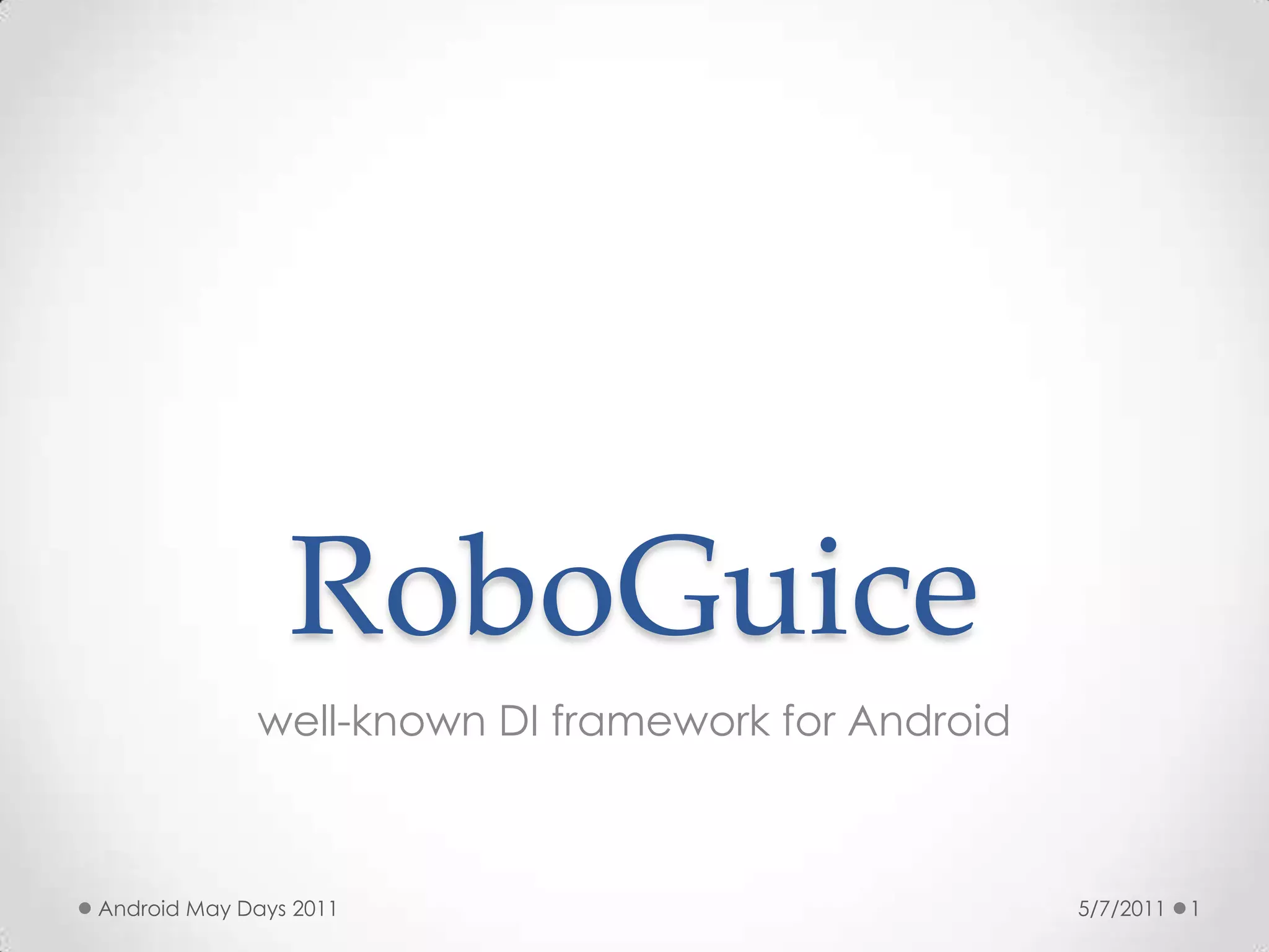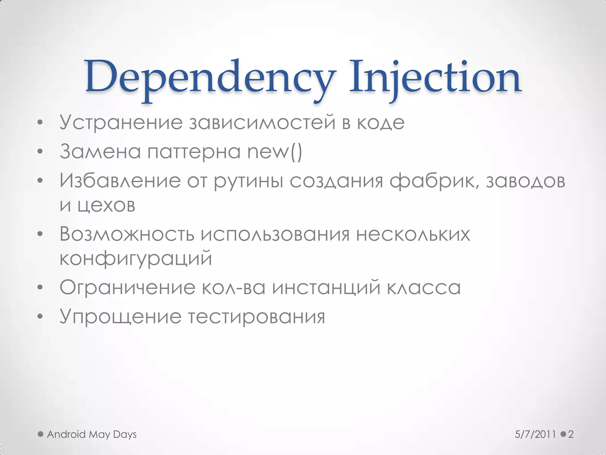 Документ описывает Roboguice, фреймворк для внедрения зависимостей в приложениях Android, упрощая создание объектов и тестирование. Он предоставляет аннотации для упрощения работы с различными компонентами, такими как представления и сервисы, и позволяет ограничить количество экземпляров классов. Также представлены примеры конфигурации и внедрения зависимостей через инжекторы и модули.
