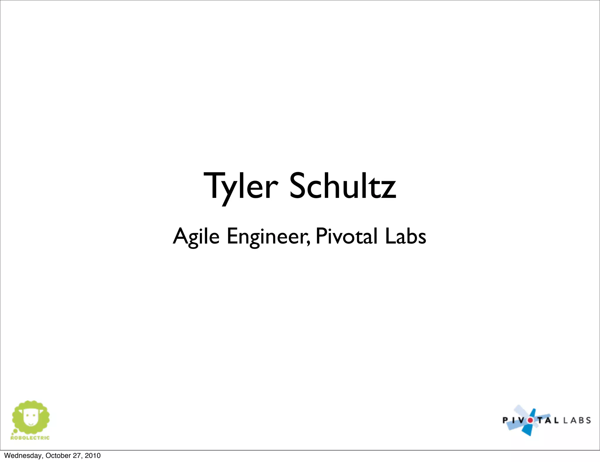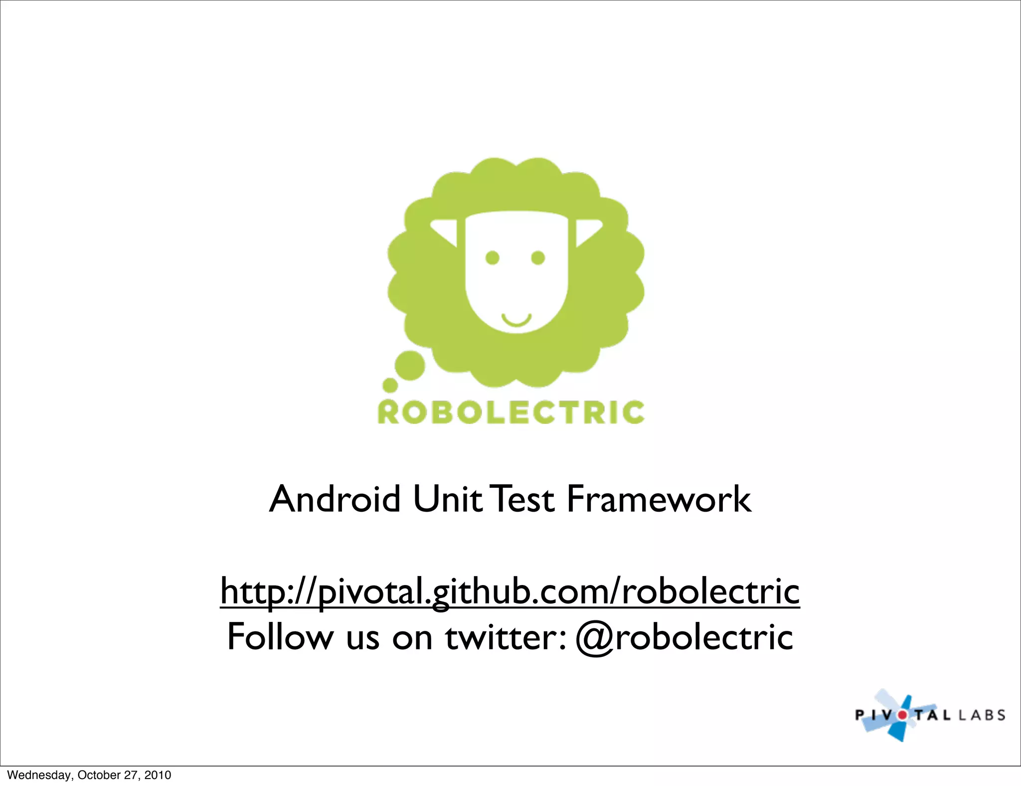 The document discusses the Android unit test framework Robolectric. It provides an overview of Robolectric, including how it works by using shadow objects to simulate the Android framework classes, allowing tests to run on a normal JVM. It also covers how to get started with Robolectric by using the sample project, and how to write tests by accessing shadow objects and dealing with classes that don't expose full state.