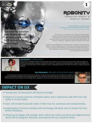 The document discusses the increasing integration of robots into everyday life, predicting that by 2015-2020 many households will own a robot. It highlights advancements in robotics, such as the Actroid-Sit which interacts lifelike with humans, and the emergence of technologies that augment human capabilities and evolve them beyond natural limitations, aligning with transhumanist ideals. The narrative concludes with a cautionary note on the potential that 'robonity' may soon replace humanity, as robots gain human-like attributes and functionalities.