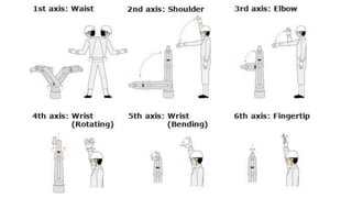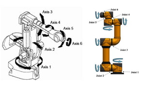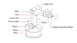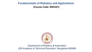 The document outlines a course on robotics fundamentals at JSS Academy, detailing course objectives, learning materials, and assessment methods. It covers robotic anatomy, configurations such as polar, cylindrical, Cartesian, and jointed arm, as well as kinematics involving forward and inverse calculations. Additionally, it explains degrees of freedom and the roles of various joints in robotic motion.