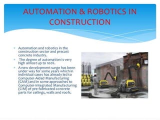 Fixed automation refers to using special purpose equipment to automate a fixed sequence of simple processing or assembly operations. Flexible automation is an extension of programmable automation that allows producing a variety of parts with minimal time lost during changeovers. Programmable automation designs production equipment to change operation sequences through programming to accommodate different product configurations.