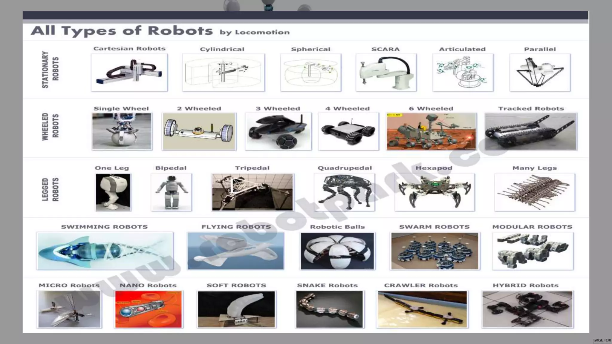 The document discusses what defines a robot and provides examples of different types of robots. It also outlines the key components that go into making a robot, including the mechanical components like chassis, joints, actuators, and transmission systems, as well as electrical and programming elements. Stationary, wheeled, legged, swimming, flying, rolling, swarm, modular, micro, nano, and soft robots are some of the robot types described.