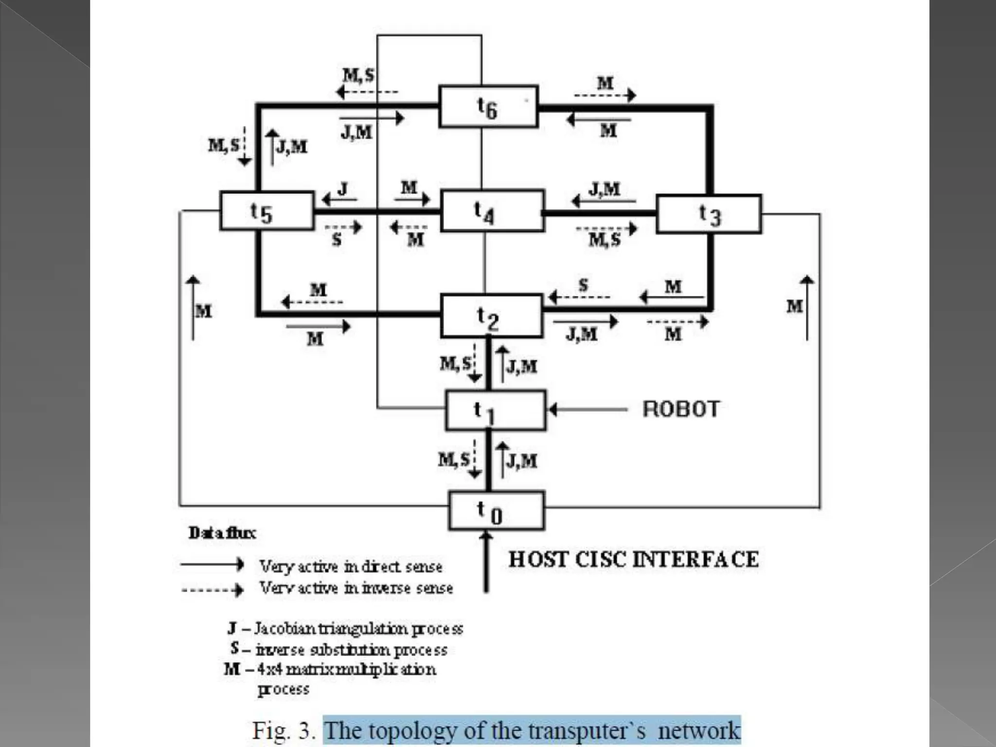 This document discusses a multi-microprocessor system for controlling the position and force of a walking robot in real time. It presents the implementation of an open architecture system that uses forward and inverse kinematics to control the robot's position in Cartesian coordinates. Experimental results showed that the open architecture control system ensured flexibility, short execution time, precision targeting and repeatability of movement programs compared to a single microprocessor system.