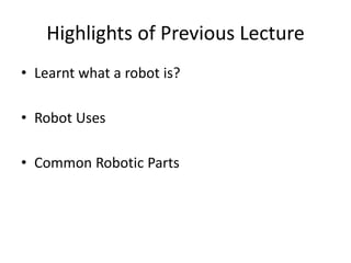 The document outlines the agenda for a robotics workshop, including an introduction to computer aided drafting software and the ProEngineer CAD program. It discusses the different working areas in robotics such as mechanical, electrical, electronics, and computers. The workshop will also cover the basics of sketching and drawing entities in CAD, including lines, rectangles, circles, and arcs.