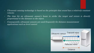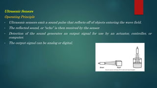 Ultrasonic sensors operate by emitting sound pulses that reflect off nearby objects. The sensor then detects the echo to determine the distance to the object. There are four main components: a transducer that emits and receives sound, a comparator that calculates distance from time of flight, a detector circuit, and a solid-state output. Ultrasonic sensors can detect most materials and are less affected by moisture than optical sensors, but have difficulty detecting soft absorbing materials. Their sensing range depends on factors like target size, material, temperature, and environmental noise. Common transducer types include piezoelectric crystals and electrostatic foils.