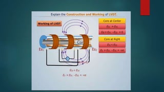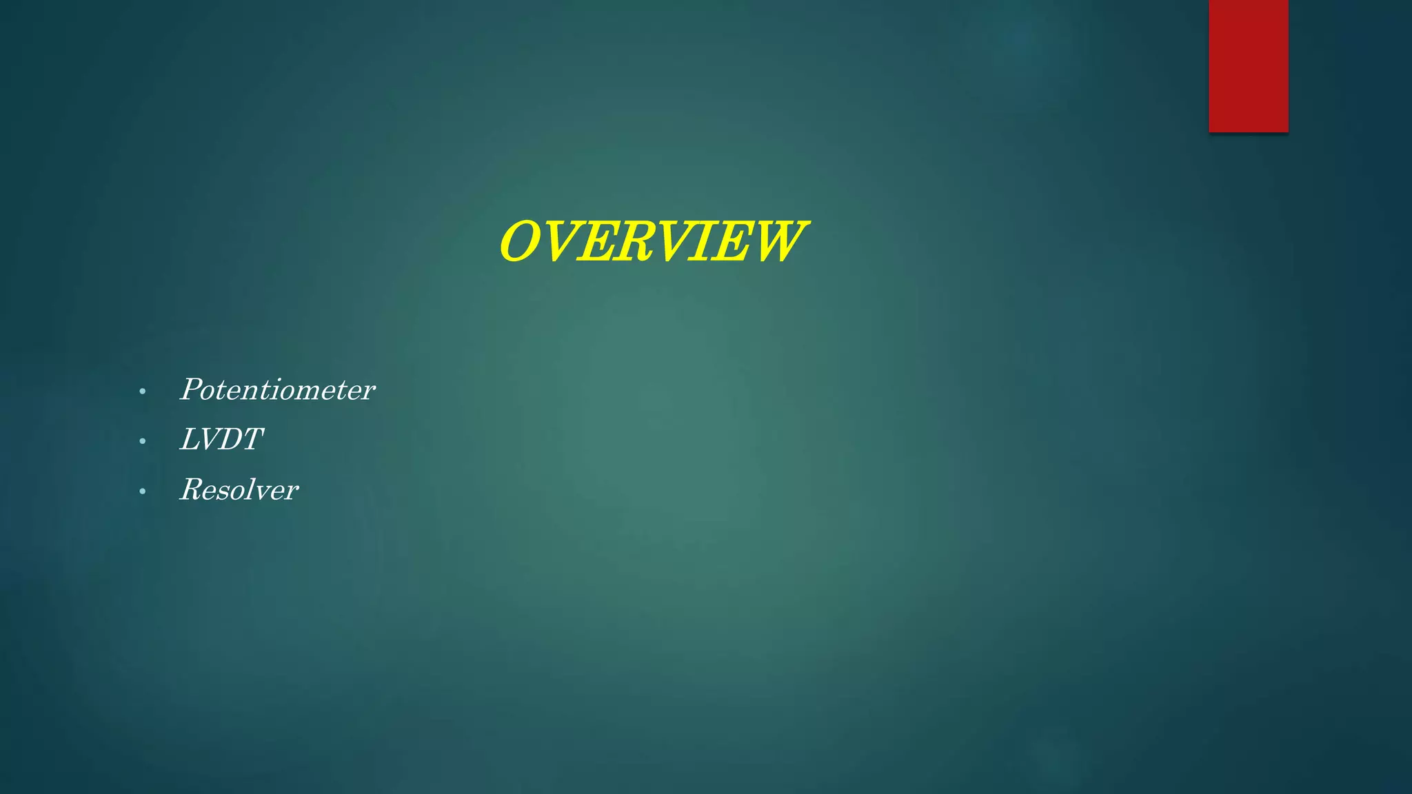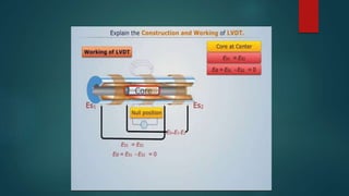 This document summarizes three transducers: a potentiometer, LVDT, and resolver. A potentiometer converts rotational or linear displacement into a potential difference based on the position of a wiper along a resistor. An LVDT translates linear motion into electrical signals using a movable core within primary and secondary coils. It determines displacement by measuring the induced voltage. A resolver measures rotational degrees using a rotating shaft to induce voltages on stationary coils, producing sine and cosine feedback currents whose magnitudes indicate the shaft angle.