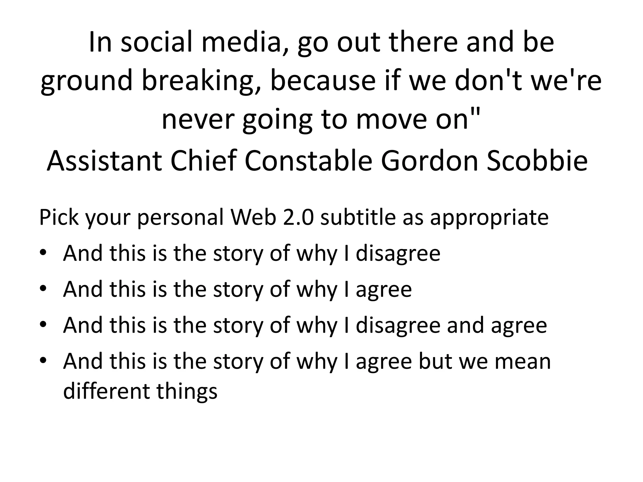 The document discusses the importance of transitioning from one-way communication to more engaging, data-driven social media strategies for effective storytelling and business success. It emphasizes the need for reliable information sources, better content, and understanding audience needs, while cautioning against focusing solely on new products without testing and analysis. Key insights include listening to customers, fixing websites, and being responsible for delivering quality information.