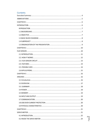 This document discusses the design and development of a robotic hand controlled by a glove. The robotic hand uses servos to mimic the motion of individual human fingers as controlled by sensors in the glove. It describes the components used - flex sensors in the glove, an Arduino microcontroller, and servos in the robotic hand. The document outlines the working principle and potential applications of this robotic hand system, such as in factories or for people with disabilities. It aims to develop a versatile robotic hand concept among business students.