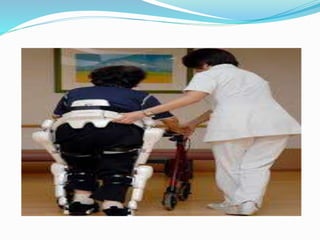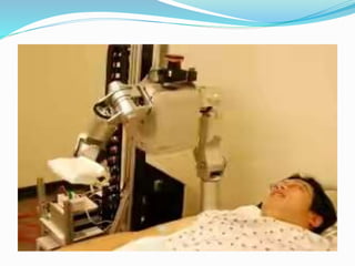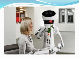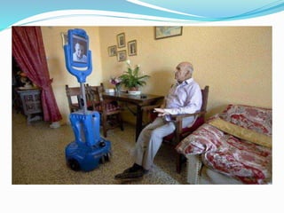 The document discusses robotic nursing and healthcare assistants. It describes several robots that are being developed to assist nurses and care for patients, including Robot nurse that can recognize faces and speak multiple languages, RIBA which can lift and move patients, and Cody which can assist with bathing. The benefits of robotic assistants are also summarized, such as helping with heavy lifting, monitoring patients, and preserving dignity. Concerns about costs, privacy, and not replacing humans are also mentioned.