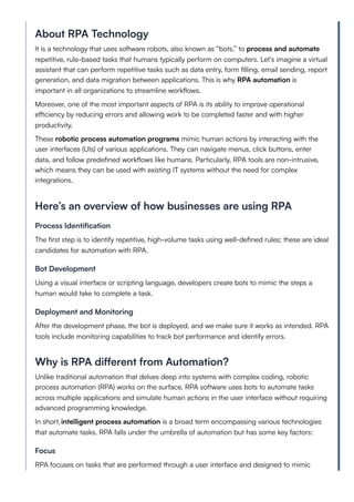 The document provides a comprehensive guide to Robotic Process Automation (RPA), highlighting its role in automating repetitive, rule-based tasks to improve operational efficiency across various industries such as finance, healthcare, and customer service. It emphasizes the benefits of RPA, including increased efficiency, accuracy, and cost savings, while also addressing potential risks like job displacement and security concerns. The guide also offers insights on selecting RPA tools and differentiates RPA from artificial intelligence, ultimately presenting RPA as a valuable asset for enhancing business performance.