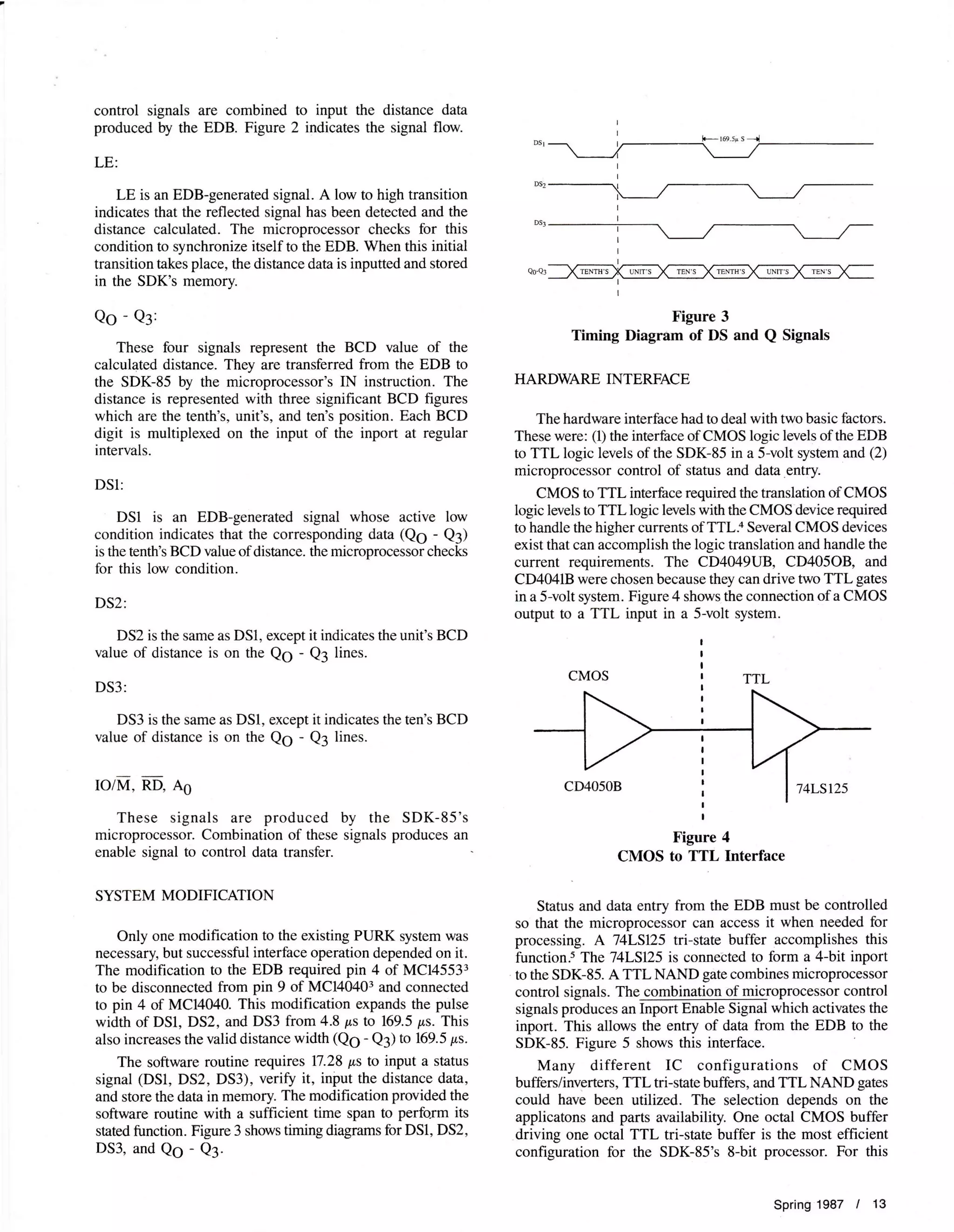 This document summarizes the interfacing of a Polaroid Ultrasonic Ranging Kit (PURK) to an Intel System Development Kit-85 (SDK-85) microprocessor to provide distance sensing capabilities for an autonomous robot. The interface required modifying the PURK circuitry to synchronize its signals with the SDK-85. A hardware interface was developed using CMOS and TTL logic devices to translate signal levels. Software was also developed to input the PURK's distance readings, synchronizing with its status signals under microprocessor control. The interface allows the microprocessor to access the PURK's distance measurements for further processing and autonomous robot control.