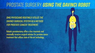 Robotic-assisted prostate surgery offers a minimally invasive option for prostate cancer treatment using the daVinci surgical system. It uses smaller incisions than open surgery, reducing risks of infection and allowing for faster recovery times. The robotic system provides surgeons with superior vision, precision, and a wider range of motion compared to traditional open or laparoscopic surgery, helping to achieve equivalent or better results. Patients concerned about prostate cancer symptoms or seeking a second opinion can schedule an appointment with a DMG urologist by calling 630-790-1221.