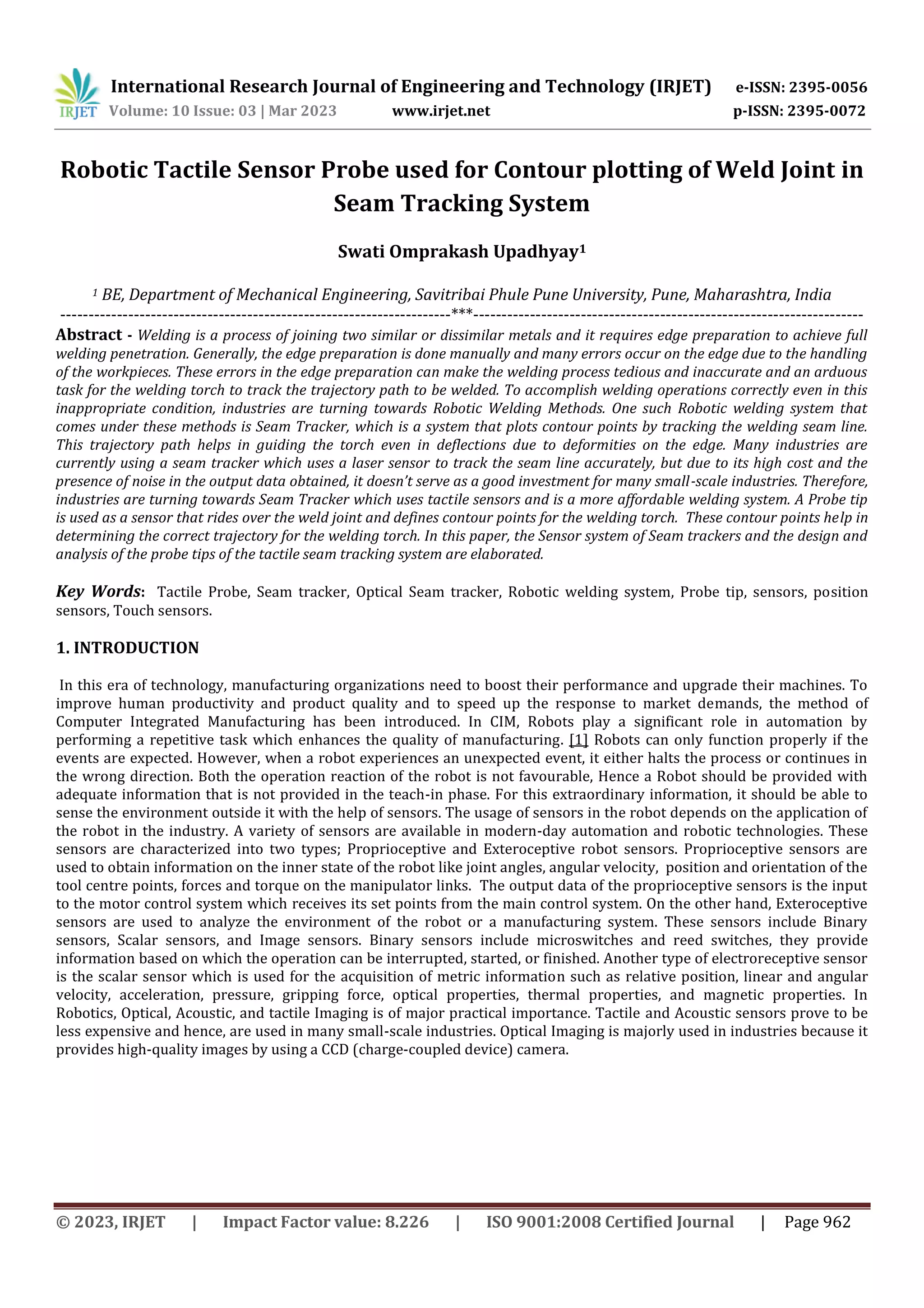 - The document discusses a robotic tactile sensor probe used for contour plotting of weld joints in seam tracking systems. Seam tracking systems help guide welding torches along deformed or irregular weld seams.
