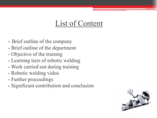 Prateek Sood completed an industrial training at VEEGEE KAUSHICKO ENGINEERING PVT. LTD. The training focused on learning about robotic welding through teaching programming, installations, cell design, and hands-on work. During the training, Prateek learned robotic functionality, welding machine basics, robot teaching, PLC programming, and production calculations. The training helped develop practical skills and confidence needed to work in the robotics and manufacturing field.