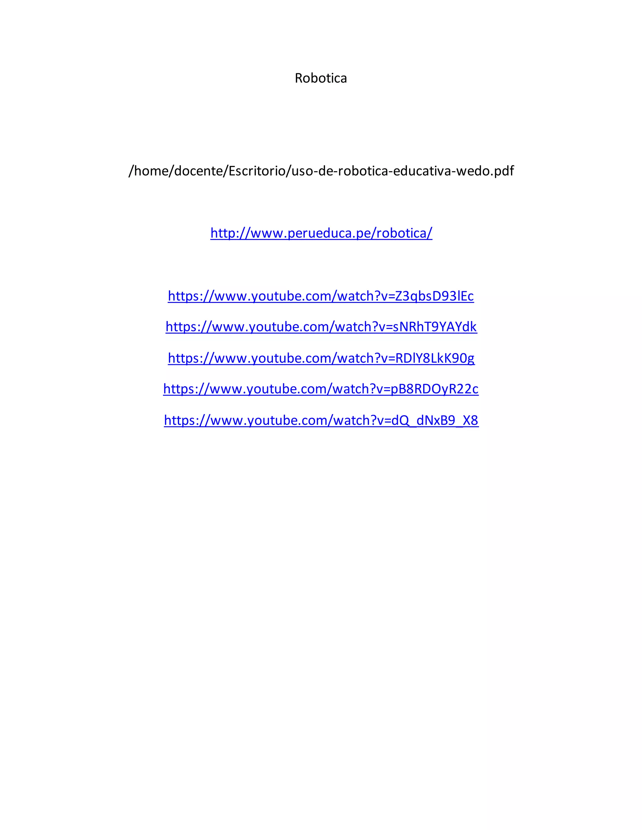 This document provides several links to resources about educational robotics including a PDF document on using LEGO WeDo in education, a website from Peru on robotics in education, and 5 YouTube videos demonstrating educational robotics projects and activities using LEGO WeDo. The links cover topics ranging from introductory information and guides on using LEGO WeDo to specific programming demonstrations and robotics projects that can be implemented in a classroom.