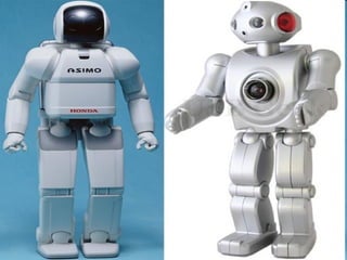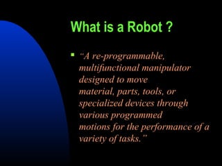 The document provides information about robots, including definitions, history, and key aspects. It defines a robot as a re-programmable, multifunctional manipulator designed to move materials through programmed motions. The term originated from a 1921 play and was later used by Isaac Asimov in 1941 to refer to machines that assist humans. Key robot aspects discussed include motors, sensors, mobility, programmability, and flexibility. Examples of present and future robots are also mentioned.